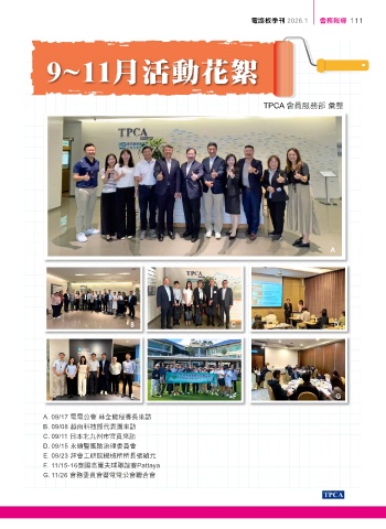 電路板季刊 2026.1 會務報導 111 9~11˜ݺਗڀഔ TPCA 會員服務部 彙整 A B C D E F G A. 09/17 電電公會 林全能秘書長來訪 B. 09/08 越南科技部代表團來訪 C. 09/11 日本北九州市官員來訪 D. 09/15 永續暨風險治理委員會 E. 09/23 拜會工研院機械所所長張禎元 F. 11/15-16泰國高爾夫球聯誼賽Pattaya G. 11/26 會務委員會暨電電公會聯合會