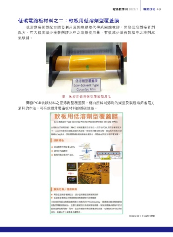 電路板季刊 2026.1 專業技術 49 Э၁ཥ༩ؐҿࣘʘɚjழؐ͜Э๓ኒۨᔧႊᇫ 低溶劑接著劑配方開發利用液態橡膠取代傳統固態橡膠,開發低溶劑接著劑 配方,可大幅度減少接著劑膠水中之溶劑使用量,有效減少塗佈製程中之溶劑尾 氣碳排。 圖、軟板用低溶劑型覆蓋膜展品 開發PCB軟板材料之低溶劑型覆蓋膜,藉由原料端溶劑的減量及製程端節省電力 消耗的作法,可有效提升電路板材料的減碳效益。 資料來源:材料世界網